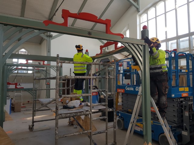 Kunnostimme myyntiloosit verstastyönä. Vaihdoimme kaikkiin pystytolppiin alapäähän pätkän uutta puuta ja jatkoimme keskialueen katto-osan palkkeja koska looseja laajennettin isommaksi kylmäkalusteiden vuoksi.